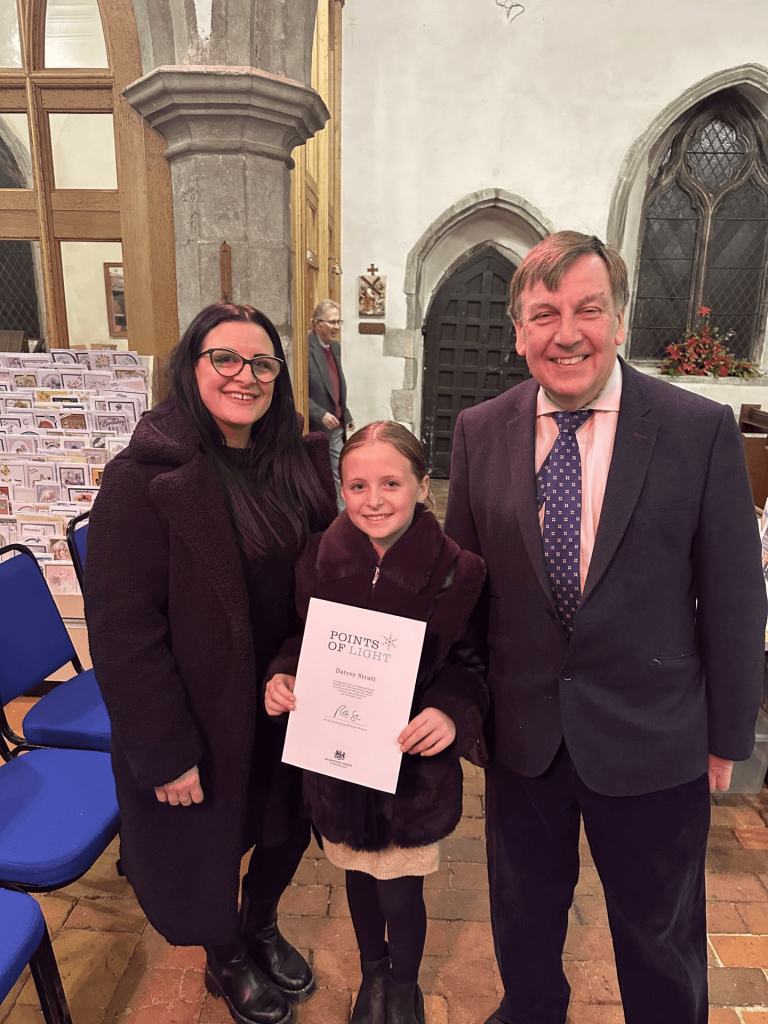 Sir John Whittingdale, MP for Maldon, presents Points of Light Award certificate to constituent Darcey Strutt, aged 10